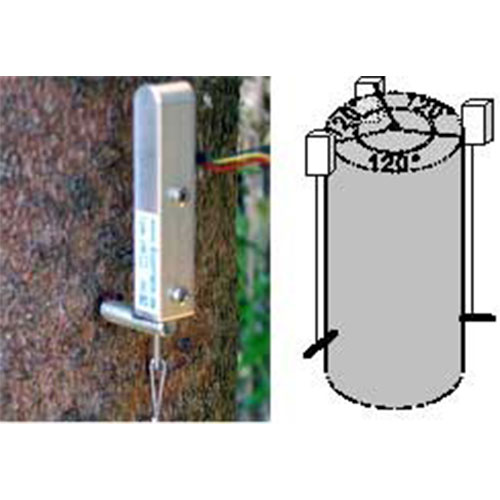 DV是專門用來連續測量樹干縱向變化(不是生長)的。樹干的長度因其含水量, 風和彎曲而發生變化,因此樹干縱向變化是一個可以用來判斷樹體含水量(干旱程度),競爭壓力和機械壓力的參數。 一般同時用三個DV,這樣可把縱向變化的原因(水分狀況,彎曲)區分開來。